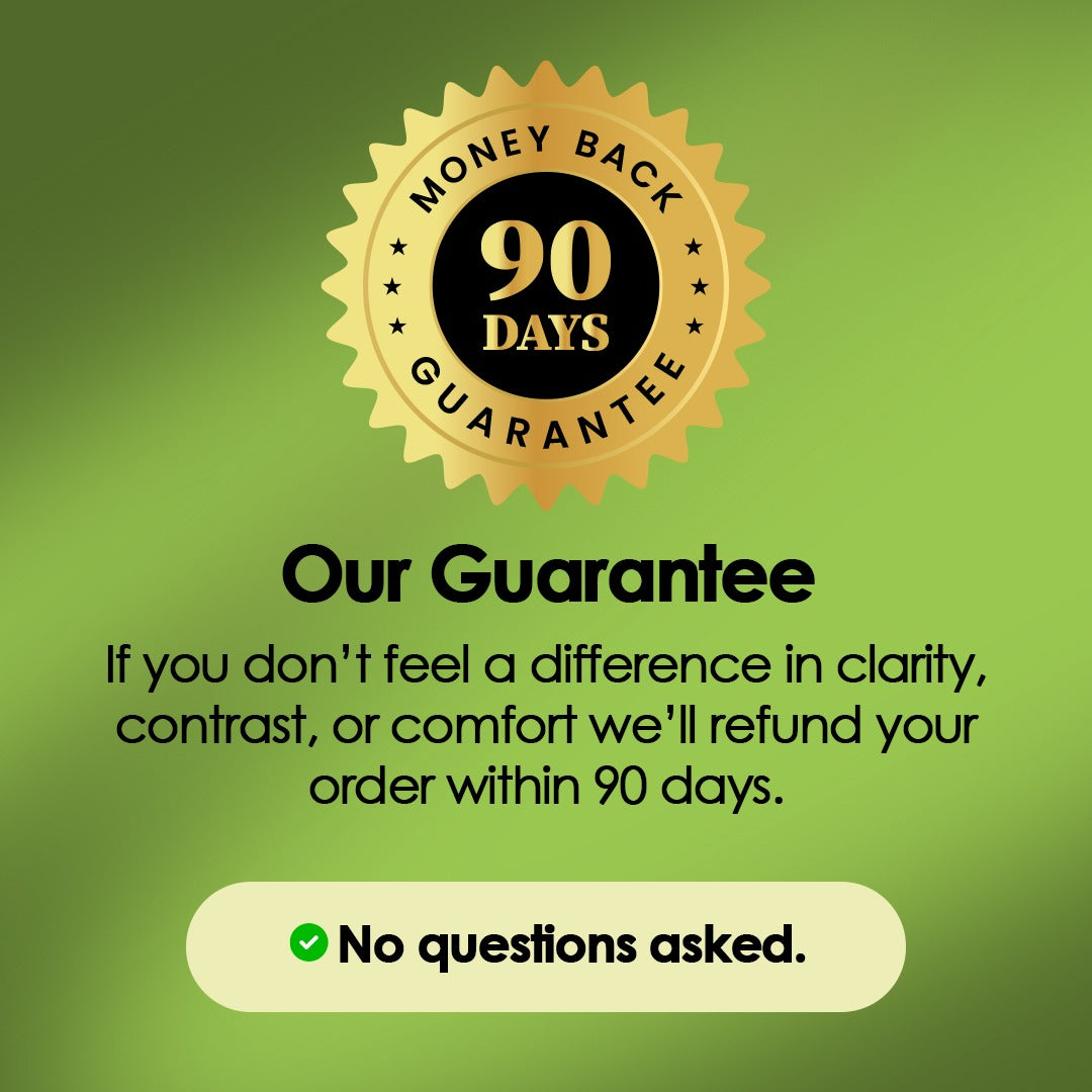 Your order today is protected by our iron-clad 90-day 100% money-back guarantee. If you are not astonished by how clear your vision becomes, or shocked when you read without squinting for the first time in years, or amazed when you drive at night without fear, then at any time in the next 90 days let us know and we'll refund every single penny of your investment. No questions asked.